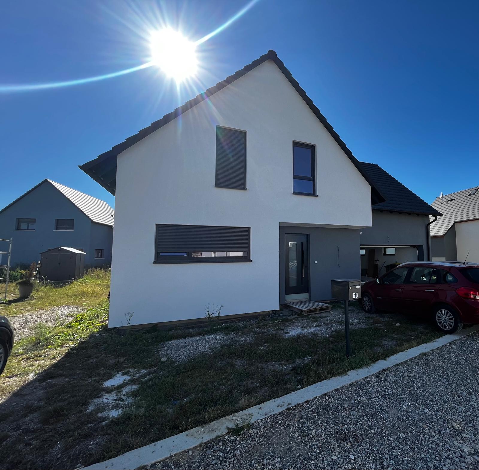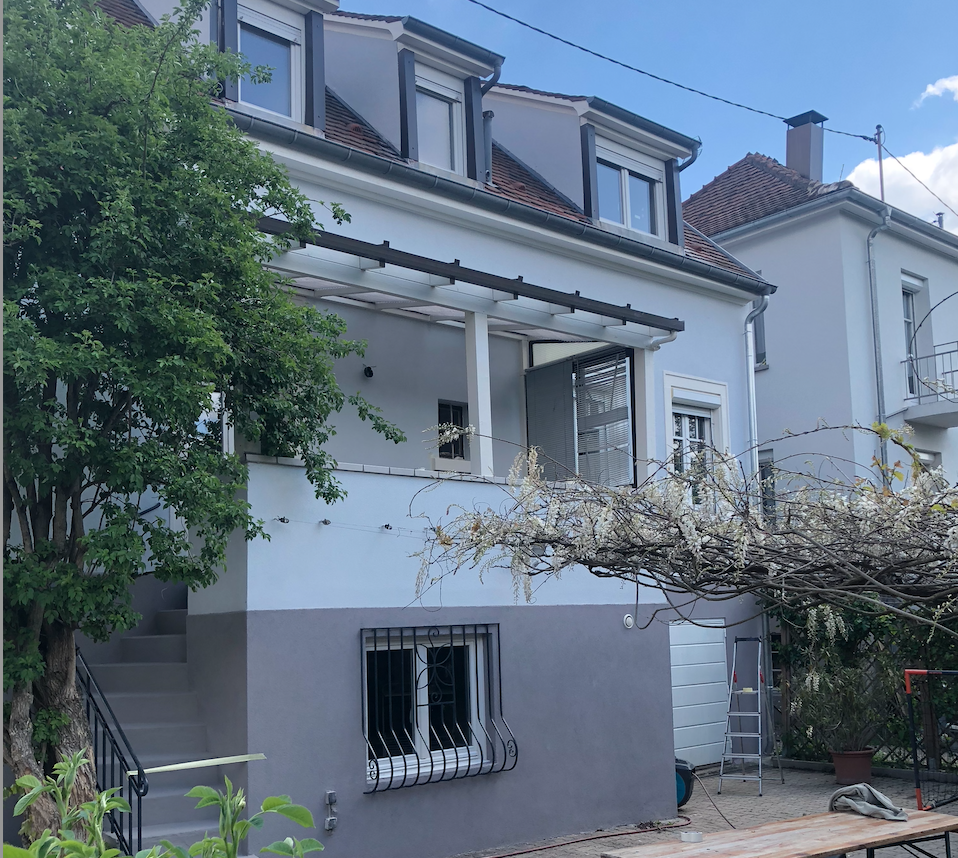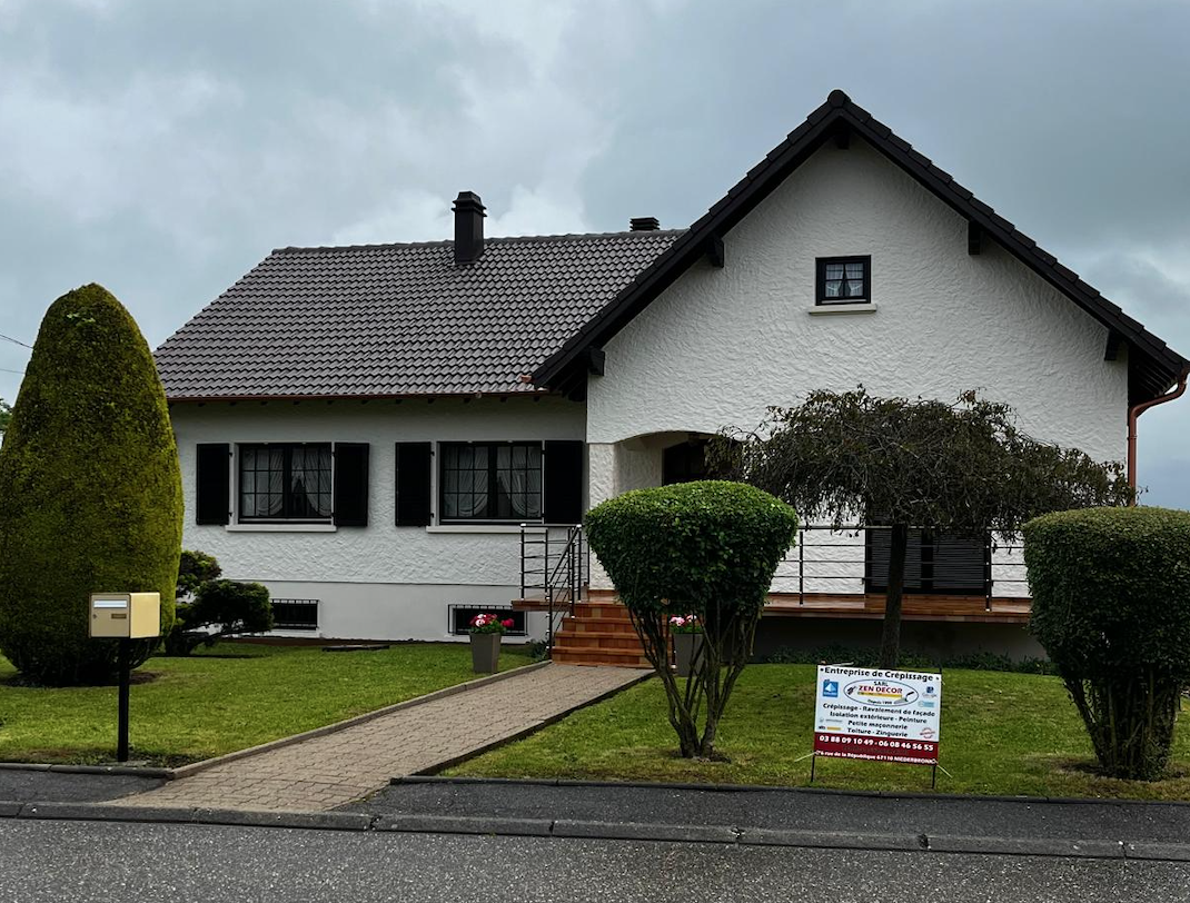 Ravalement complet de la façade de cette maison à Strasbourg plus précisement à Lingolsheim, avec nettoyage des murs et application de peinture résistante aux intempéries. Cela a non seulement ravivé l’apparence de la maison mais a aussi amélioré sa résistance au vieillissement des matériaux.